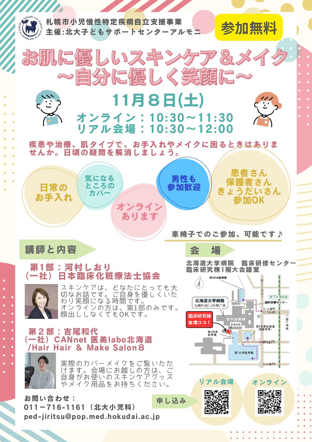 【リアル参加】お肌に優しいスキンケア&メイク~自分に優しく笑顔に~(主催アルモニ)先着30名 開催日 2025年11月8日 対象 教育関係者 患者様・ご家族様 事業者 医療関係者 参加無料。車いす、ストレッチャーの方も参加できます。男性の患者様方も歓迎です。